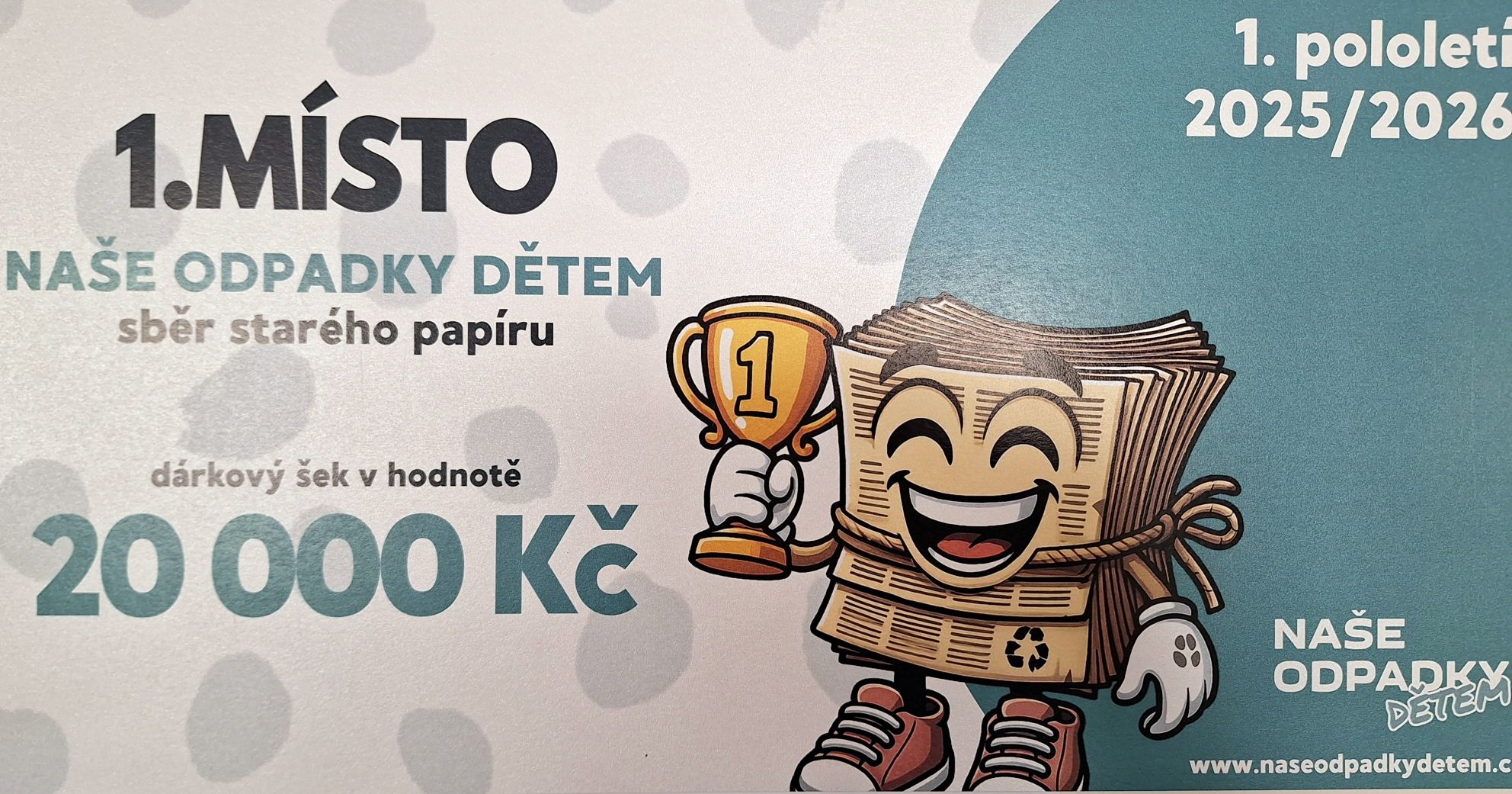 Dnes škola obdržela šek v hodnotě 20 000 Kč za krásné 1. místo – sběr papíru v rámci celé ČR.
